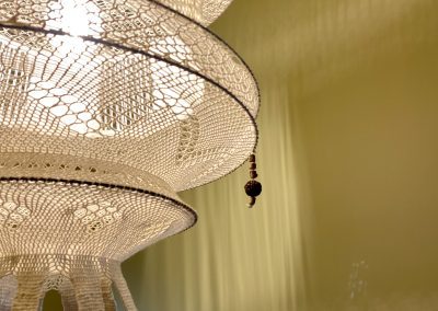 Richiama suggestioni esotiche che si ritrovano anche nei dettagli decorativi: il lampadario artigianale e lo specchio dorato contribuiscono a creare un’atmosfera vibrante, solare e decisamente unica.