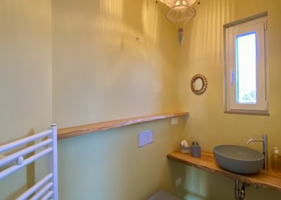 Affacciarsi da questo bagno significa lasciarsi sorprendere da una spettacolare vista sul mare. Uno scenario che amplifica il senso di benessere, trasporta la mente lontano e rende questo piccolo ambiente un vero rifugio per i sensi.